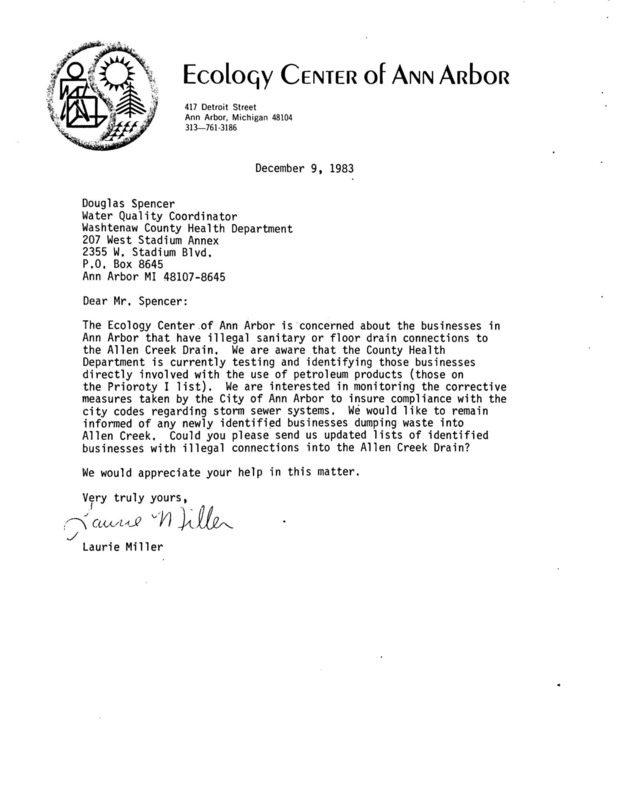 Letter to Washtenaw Water Quality Coordinator